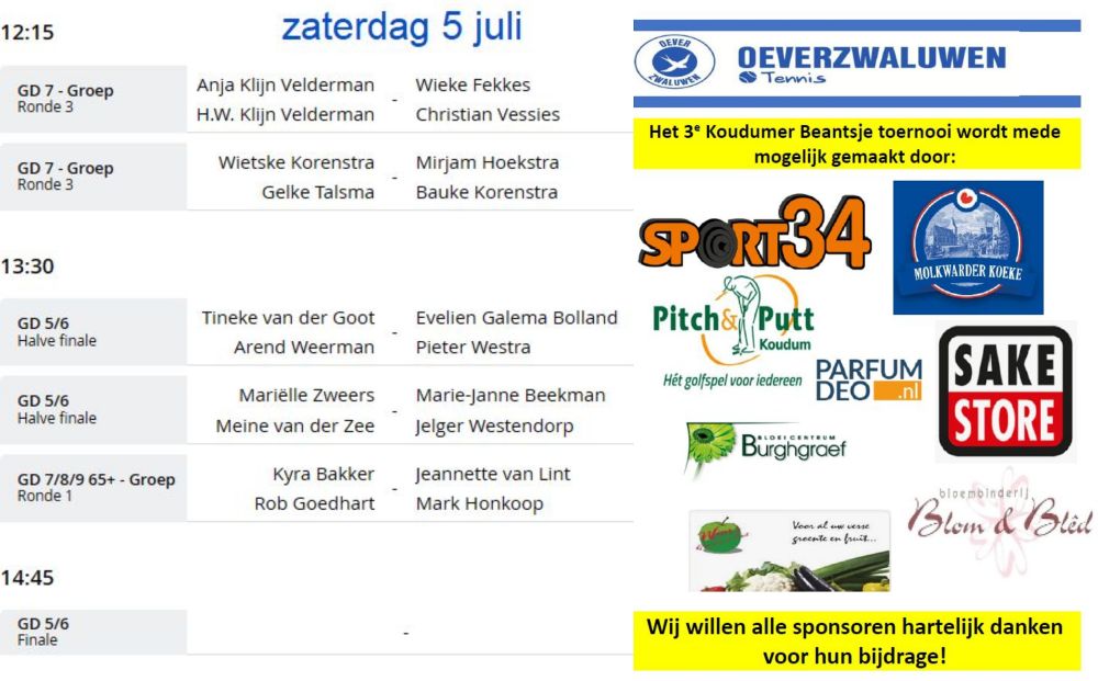 Hieronder het wedstrijdschema voor zaterdag 5 juli. Het 3e Koudumer Beantsje Toernooi wordt georganiseerd door een enthousiaste groep vrijwilligers van Oeverzwaluwen Tennis en wordt mede mogelijk gemaakt door een aantal sponsors. Niet vermeld op de poster van de sponsors is kwekerij Trimpe die de vers geplukte ‘beantsjes’ gratis ter beschikking stelde.